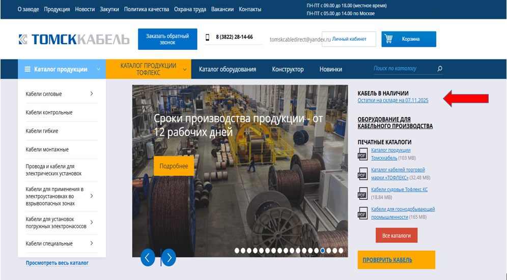 Актуальную информацию об остатках на складе вы можете увидеть на сайте www.tomskcable.ru перейдя по ссылке «КАБЕЛЬ В НАЛИЧИИ» или запросить у вашего менеджера.